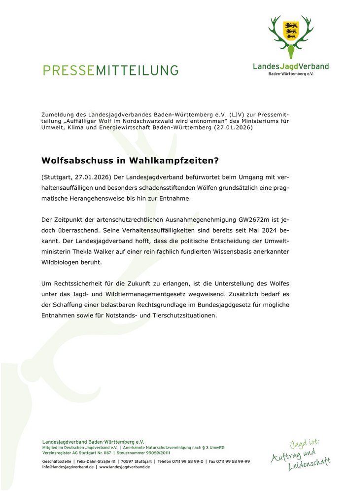 Zumeldung zur Pressemitteilung „Auffälliger Wolf im Nordschwarzwald wird entnommen“ des Ministeriums für Umwelt, Klima und Energiewirtschaft Baden-Württemberg